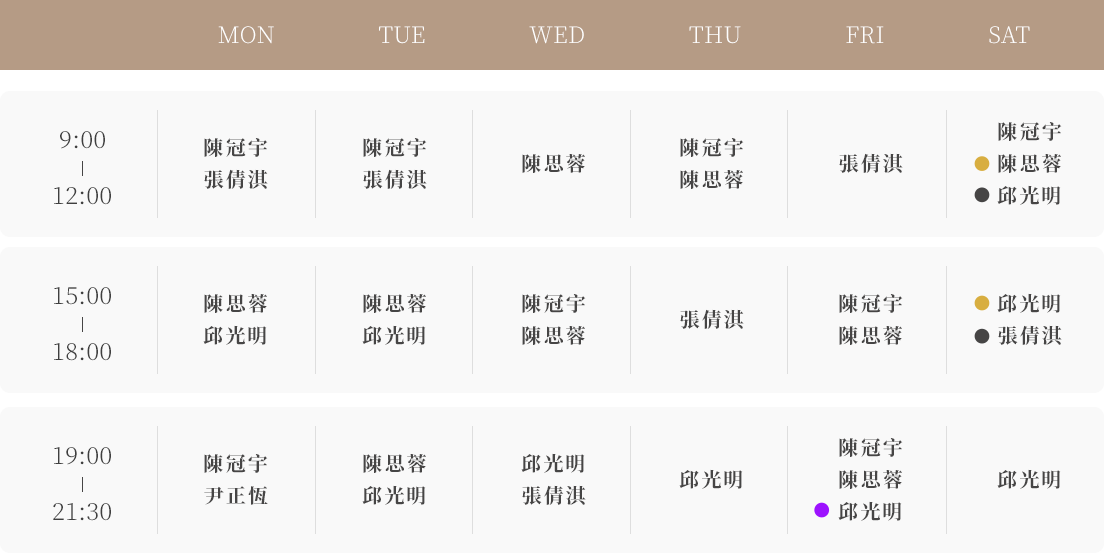 上午 09:00 - 12:00 ‧ 下午 02:30 - 05:30 ‧ 晚上 06:30 - 09:00